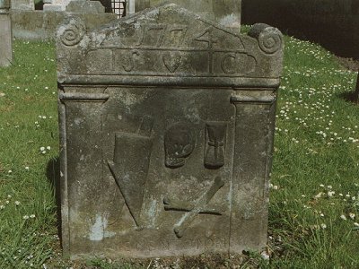 Spirals in top corners; Plough Share & Coulter; Skull; Upright hourglass; Crossed bones; Memento Mori