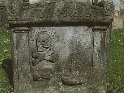 Spirals in top corners; Memento Mori; Skull; Crossed Bones; Hourglass on its side; Single masted ship, Bowsprit with 2 foresails; Main sail with boom & gaff, Flag flying against wind;