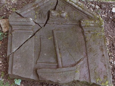 Hourglass on its side; Single masted ship; Bowsprit with 2 Fore sails; Main Sail with boom & gaff; Flag flying with the wind;